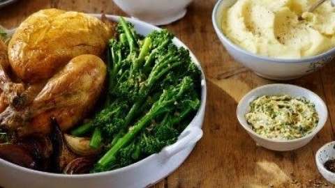 During the last 10 minutes, add the Tenderstem® to the tray so it steams and crisps in the chicken’s juices.